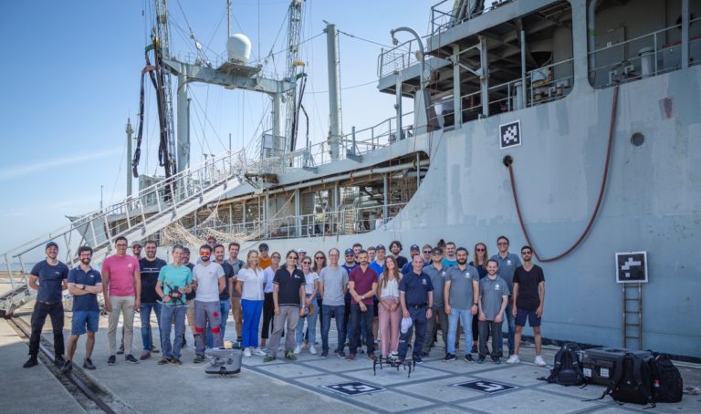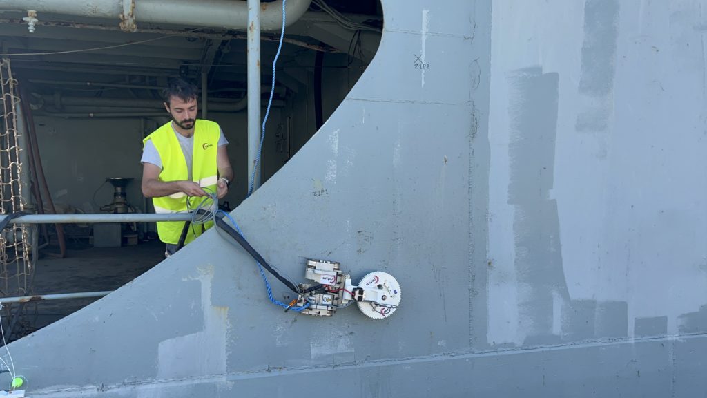 Simon Ferrier and Olivier Simonin from INSA Lyon took part in the integration week in Lisbon at the shipyard. One of our objectives was to acquire real configurations of hull surfaces: the shape of the hull, the presence and shape of obstacles, and areas off-limits to robots. We collected images and data from the supply ship provided by the Portuguese navy. We also supported our partner LakesideLab (LSL) when they carried out experiments with drones. In particular, we recorded their experiments (several videos of these experiments were produced).