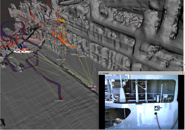 As part of these developments and integration efforts, a number of tests were performed on the outer hull of a real vessel for checking the suitability of the processes that lead to the generation of the localization framework [developed by the Univ. of Klagenfurt team]. The localization framework is based on visual markers (ARUCO tags) and an Ultra-Wide Band network. The rest of robots involved in a BW2 inspection mission make use of the resulting calibration to plan their motion and conclude the inspection at a more detailed level. Continuing with the developments and integration efforts, a number of tests were performed for checking the suitability of the processes leading to building the mesh of the outer hull of the vessel. The mesh, apart from being an output of an inspection mission, is intended to be useful for the rest of the robots of the inspection pipeline, as input for their motion planning modules.