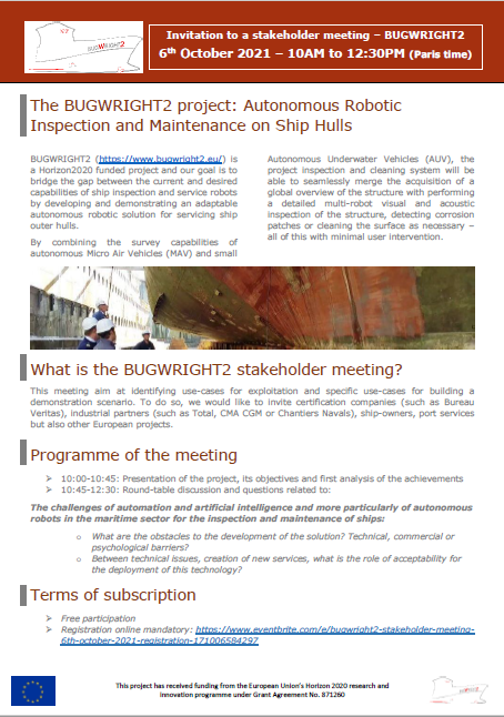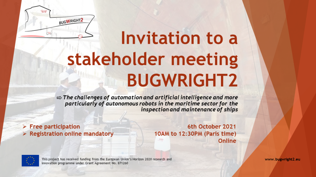 On behalf of the BUGWRIGHT2 consortium, we are pleased to invite you to our upcoming online stakeholder meeting that will take place on 06th October 2021, from 10:00 AM to 12:30 PM. Our main topic will be on The Challenges of automation and artificial intelligence and more particularly of autonomous robots in the maritime sector for the inspection and maintenance of ships.